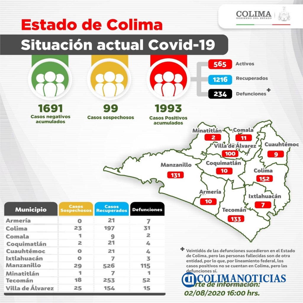 Colima.- Las instituciones del Sector Salud reportaron que este domingo 2 de agosto se registraron 39 nuevos casos por COVID-19 y 6 defunciones, con lo que el Estado suma 1993 casos y 234 decesos acumulados por esta causa en la entidad.